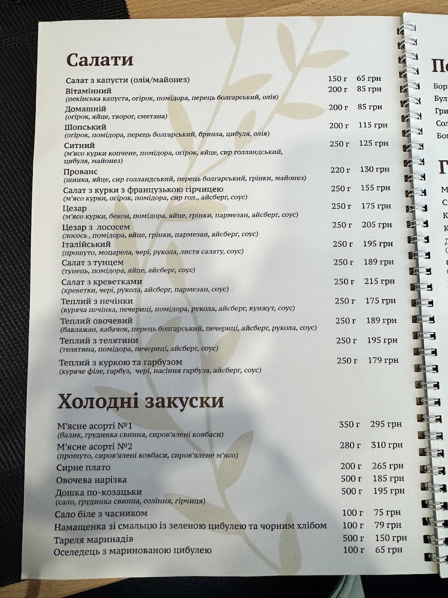 As you step inside, you are embraced by a cozy atmosphere that feels reminiscent of a grandmother's kitchen—perfect for settling down and enjoying a meal with friends or family. The café boasts a delightful menu, offering a selection of dishes that highlight the rich flavors of local cuisine. From mouthwatering Млинці з Сиром Та Сметаною (Crepes with cheese and sour cream) at UAH 95.00 to the satisfying М’ясне Асорті (Meat Assortment) that features a variety of cold cuts, every bite is a journey through true Ukrainian flavors.